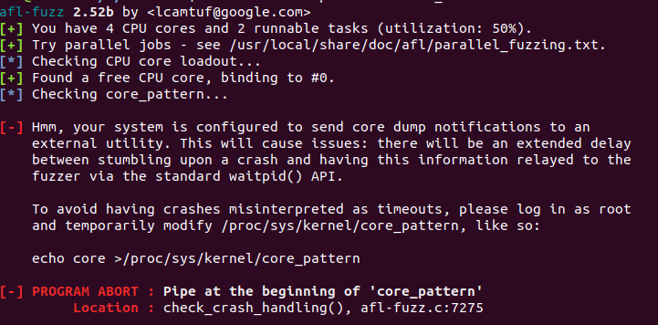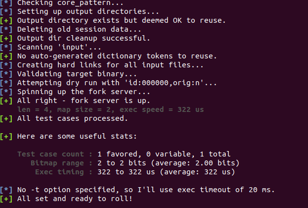 接着再运行以下指令,就开始正式的fuzzing了(其中-i参数跟随的是输入文件夹,-o跟随的是输出文件夹):