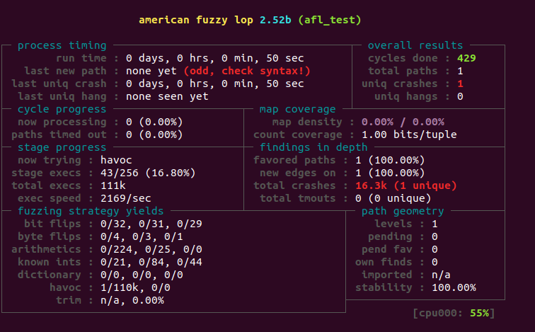 1 | $ afl-fuzz -i input -o out -Q ./test |