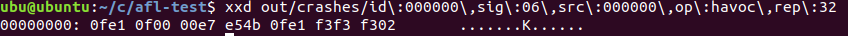 其中crashes文件夹下的文件即为产生程序crash对应的输入内容,可以用xxd来分析,从而获得漏洞点: