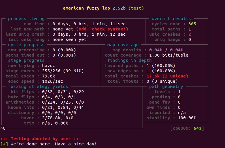 其中,overall results框中的cycles done表示运行的总周期数。随着不断fuzzing,周期数会不断增加,其数值的颜色也会由洋红色变成黄色、蓝色、绿色。因为afl-fuzz是一个无限循环运行的,而当cycles done对应数值的颜色变为绿色时,代表可执行内容已经很少了,此时即可用ctrl+c来手动终止fuzzing。