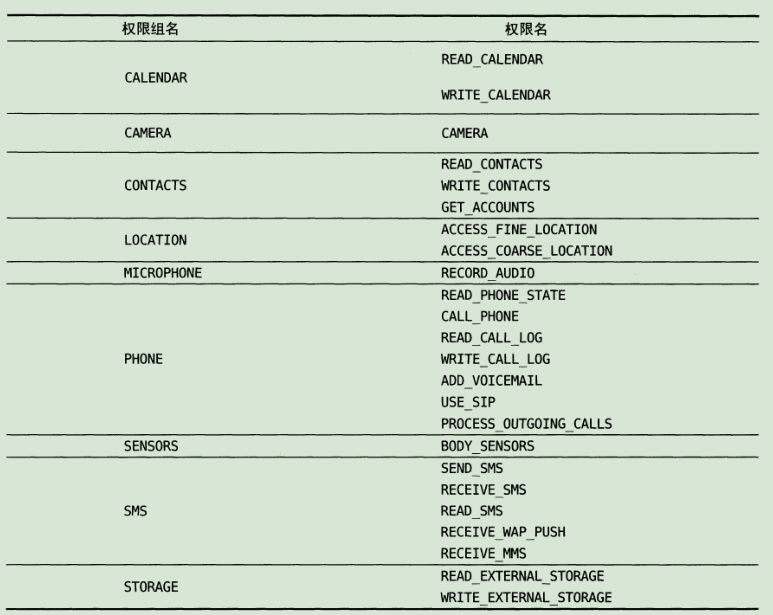 Android权限分为2类:普通权限和危险权限。在Android6.0版及以上本引入了运行时权限,用户需要手动授予危险权限才能使用,并且一旦授权其对应权限组下其他权限也会被授权。